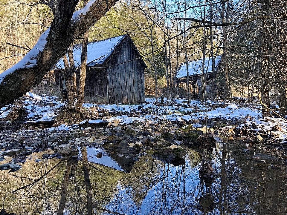Historic structures, including a hand-hewn timber building, and a 125-year-old farmhouse; all ready for repurposing, offering salvageable historic wood and materials for restoration projects or rustic design elements. Interior roads lead up to a rolling hilltop with excellent building sites for a homestead, cabins, or a private retreat layout.