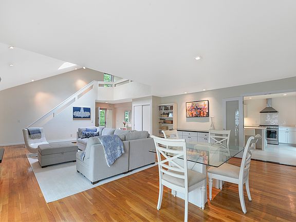 Escape to this contemporary 3 + bedroom retreat perfectly situated only two miles from the ocean, with private, deeded access to Shinnecock Bay - perfect for kayaking, paddleboarding, or enjoying the peaceful waterfront. The bright, sun-filled main floor features an open living and dining area with soaring cathedral ceilings, a spacious kitchen with center island ideal for gathering, and a separate sitting room/sunroom that leads out to the back deck. A first-floor bedroom and full bath offer comfort and convenience for guests or flexible living arrangements. Upstairs, the expansive primary suite offers a true retreat, complete with a renovated en-suite bathroom, a private office, and a balcony overlooking the yard. One additional bedroom, a bonus room, and a full bath complete the second floor. Outside, enjoy a heated pool, large private yard, and easy access to nearby ocean beaches and the heart of Hampton Bays. This home offers the perfect blend of privacy, comfort, and location for the ideal summer getaway