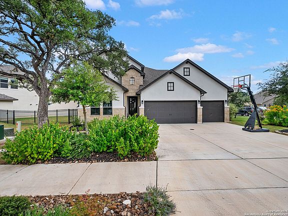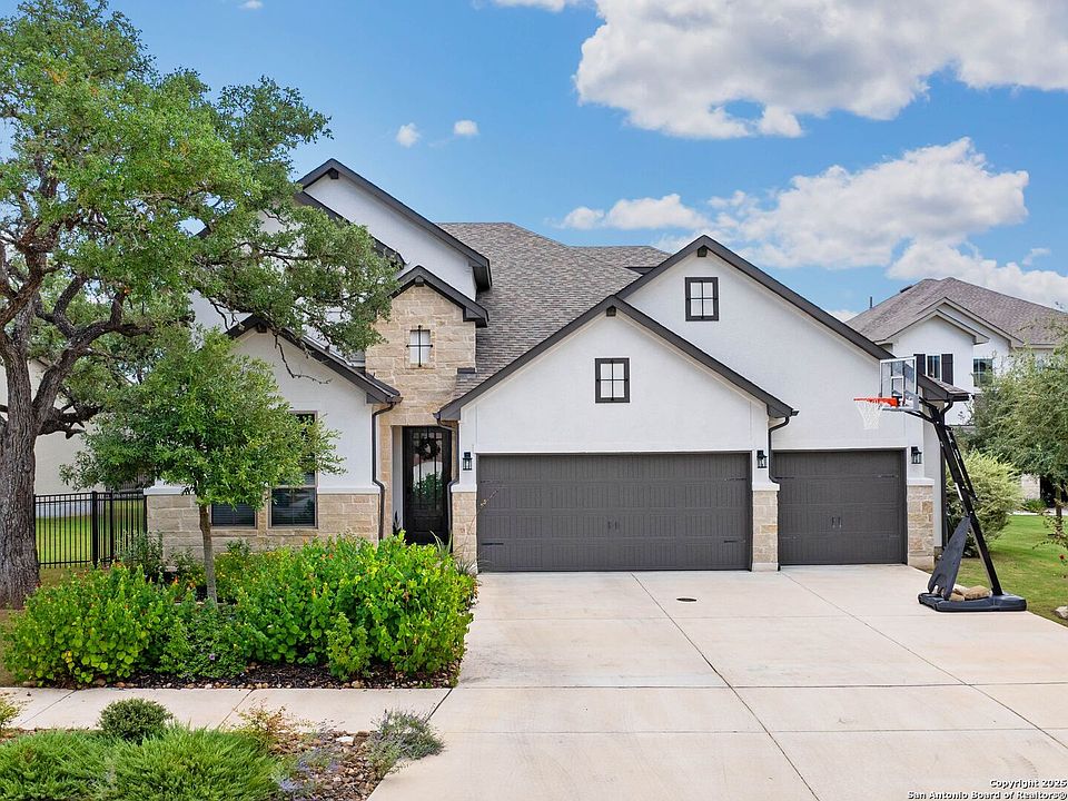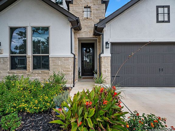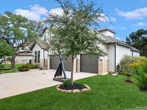 Welcome to 122 Milagro-a beautifully appointed 4-bedroom, 2.5-bath residence with an office, game room, and numerous high-end upgrades, tucked away on a private cul-de-sac in the gated Esperanza community of Boerne. This 2,949 sq. ft. home was thoughtfully designed to balance everyday comfort with stylish elegance and is move-in ready. Step inside to discover an open and inviting layout filled with natural light. The main living areas feature custom blinds, bright and spacious gathering spaces, and a dedicated home office perfect for working from home or managing daily tasks. The well-appointed kitchen and dining flow seamlessly for entertaining. Upstairs, the large game/family room offers flexibility for movie nights, play space, or a second living retreat. The primary suite is a true retreat with bay windows that capture peaceful backyard views and a spa-like ensuite bath. Throughout the home, you'll find high-end finishes, a tankless water heater, and carefully selected upgrades that elevate both style and function. The outdoor living spaces are equally impressive. An extended covered patio provides the perfect setting for morning coffee or evening entertaining, overlooking beautifully landscaped grounds. The backyard includes a rod-iron fence, lush greenery, and a custom putting green designed for relaxation or fun. An oversized 3-car garage offers exceptional room for vehicles, storage, or hobbies. Living in Esperanza means enjoying resort-style amenities right outside your door. Residents have access to a pool with lazy river and splash pad, a fully equipped fitness center, sand volleyball courts, a dog park, the Roca Loca Lawn for events, and miles of scenic walking trails. With Herff Elementary located directly across the street and being part of the highly acclaimed Boerne ISD, this home combines elegance, convenience, and a strong sense of community.