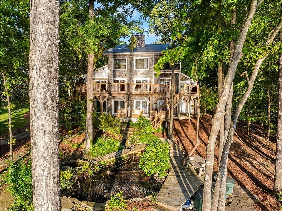 Lakefront living on beautiful High Rock Lake! Welcome to 122 Mountain Harbor Drive! This incredible estate offers over 4000sqft of living space! This home also includes a 1,800+ sq ft heated rec center not counted in total heated area, all on over 3 acres of land! The main home features a recently renovated primary bath, 2 main level bedrooms, screened porches, sunroom, office, theatre room and wraparound decks. Outdoor amenities include a koi pond with waterfalls, bocce ball court, riding trails, and a private pier! Detached 6+ car garage plus 2-car attached and 1,700+ sq ft unfinished area with HVAC in place. This building has a workout space, racquetball court and additional attic space for expansion! Currently used as a private residence and an AirBNB! Truly too much to list for this one of a kind home! The potential for more revenue is here! Don't miss out on the best value for this type of home on one of North Carolina's largest lakes! Truly too much to list! See it today!