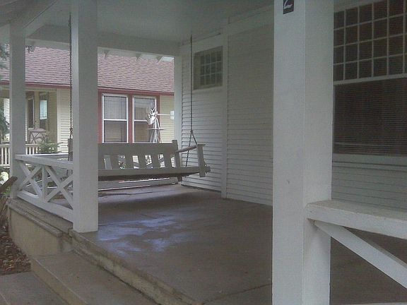 - 2 story home has a big yard, mature trees, covered front porch with chair swing.