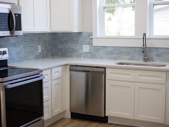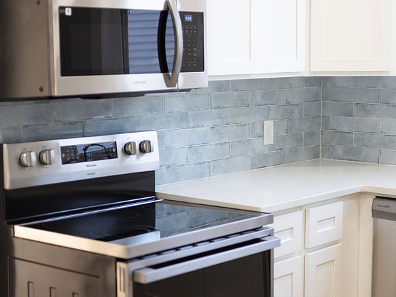 New kitchen with quartz countertops, stainless appliances, and blue tile backsplash