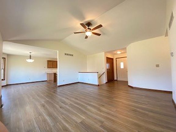 You'll be comfortable with all the space you need in this home! The entry features a large closet to welcome your guests and the shining gleaming floors are a wonderful luxury feature. The stunning cathedral ceiling in the living room, an island in the kitchen with a snack bar and pantry, what more could you need? In addition, kitchen is stocked with a stove, refrigerator and dishwasher. The kitchen has a wrap around counter for extra prepping space or space to have a snack and opens up into the dining room making serving a meal easy. The kitchen also has beautiful stained upper and lower cabinets for plenty of space for small appliances and food storage. Off of the dining room is a sliding patio door that leads to you private backyard for games and BBQ weekends.