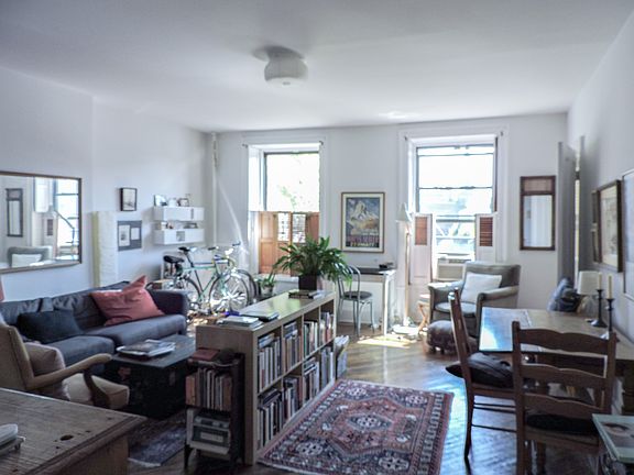Beautiful Brownstone! Wonderful light and space. Hardwood floors, high ceilings. Exposed Brick Charming details. Big windows facing south, overlooking quaint carriage houses and the gardens. Three flights walk up to the 4th floor. Best location for transportation. No pets please. Immediate occupancy