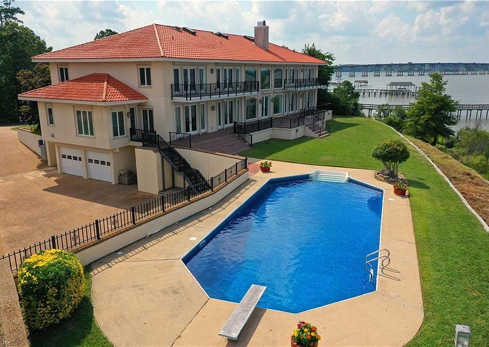 Spanish contemporary luxury awaits you at this waterfront estate on the Nansemond River. Exceptional 7,268 SF home situated on 1.27 AC. Enter through carved custom doors to a marble foyer with Swarovski chandeliers. Spectacular double staircases leads to the 2nd floor. Extensive marble floors, floor to ceiling windows will captivate you to enjoy spectacular water views from every room. Manicured landscaping, circular driveway, carport, motorized hurricane shutters, in-ground pool with extensive views of the Nansemond River. Pool/Game room. 5 spacious bedrooms, 5.5 baths, 3 ensuites; primary en-suite includes office, jacuzzi and oversized his/her closets. Truly amazing kitchen equipped with gas and electric cooktops, breakfast bar, granite counter tops and a smaller fully equipped kitchenette. Geo-thermal heating/cooling, 4-car garage with space for workshop. Extensive finished attic. Welcome to this exquisite custom designed home! 2025-01-27