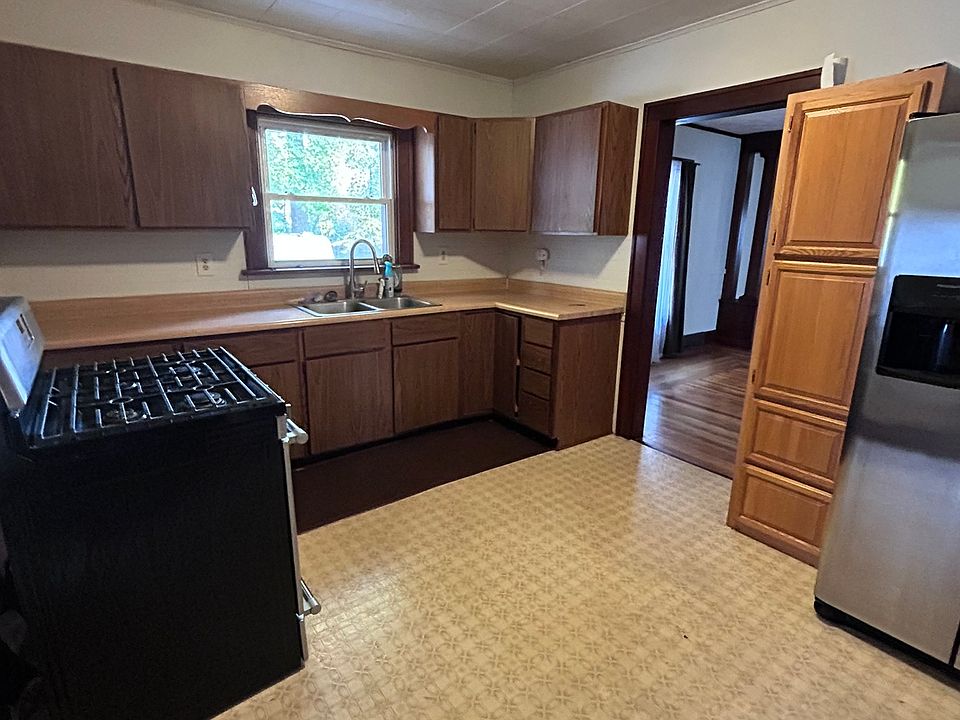The kitchen comes with a newer stainless steel fridge, stainless steel gas range and plenty of cupboard space.