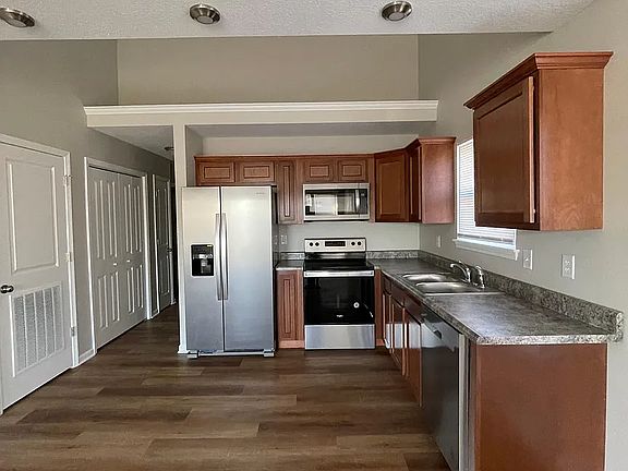 TWO BEDROOM brick duplex One car garage, solid lvp flooring throughout, new interiors - this is only one year old! One of few units that backs up to trees and is private. Great location and low rents! Washer & dryer is included. one year +