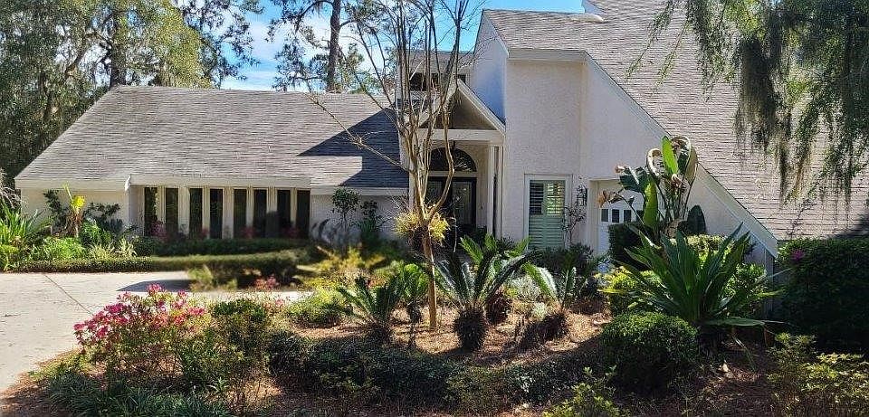 This renovated custom home offers island living at its best. A perfect blend of contemporary open space with the Saint Simons Island classic style. Your own private retreat with easy to maintain grounds of mature landscaping and nature views. This elegant home features expansive living areas with vaulted and cathedral ceilings. The interior flows from open areas perfect for relaxing and entertaining to a tropical outdoor landscape featuring recently installed covered pergolas and a large south-facing open space for sunbathing. A second floor balcony is perfect for enjoying serene views and wildlife. An open concept sunroom showcases new floor to ceiling windows offering a panoramic view of the marsh and nature. The spacious family room features a beautiful brick fireplace, stained wood tongue & groove ceiling, and exposed beams. The formal dining room adds to the luxury feel of the home, leading to a well appointed kitchen with island cook top, built in stainless appliances, granite counters. The upstairs primary suite is a retreat in itself with a large private deck, sitting area, vaulted ceiling, dual dressing areas, marble shower, and 4 closets. The main floor has a second en-suite bedroom with a large bathroom. Also situated on main floor wing is an additional guest bedroom with its own full bath. There are many other features and improvements made by the seller including: added carport, whole house water filtration system, installation of natural gas that services the tankless water heater and ready to bring into the kitchen, fireplace, or outdoor gas grille. Enjoy marsh views enhancing the peace and tranquility of this hidden gem. Don’t miss out on this opportunity to own such a special place. The property is one of the larger lots in the exclusive Sea Palms Golf and Resort Community – which offers residents optional memberships to golf and community clubhouse amenities. The yard is spacious enough for adding a pool! Close to beaches! to Viewing by appointment only.