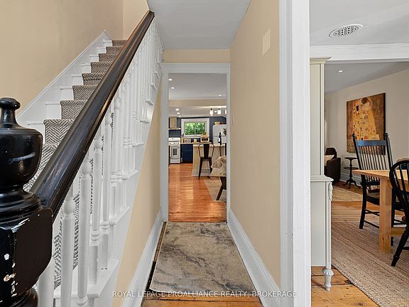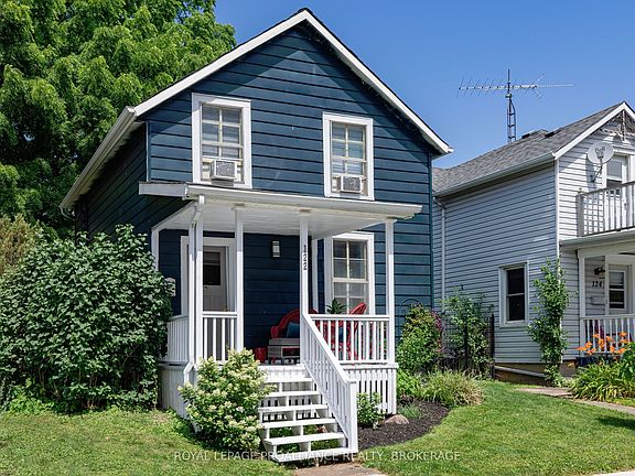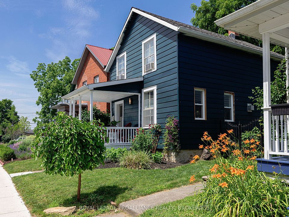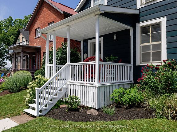 Oh the preferred South Ward in vibrant Gananoque! Step out your front door and you are minutes away from the waterfront, restaurants and pubs, the Thousand Islands Playhouse and delightful local shops! Ride your bike on the Thousand Island parkway. Enjoy your coffee on your front porch with river views! This charming one and a half storey home with original flooring and warm woodwork, has a freshly upgraded kitchen with quartz countertops and modern cabinetry. Living room with wall mount air conditioner / heat pump and gas freestanding woodstove for cozy winter nights. There is a wee sun room/ mud room with newly installed main floor laundry which leads out to a private treed backyard with garden shed. The handy South Alley lane provides access for 3 parking spots at the rear of the property. Upstairs there are two bedrooms and a 4 piece bath with a vintage claw foot bathtub. An easier lifestyle awaits you in Gananoque today!