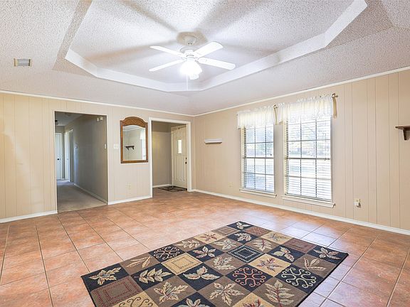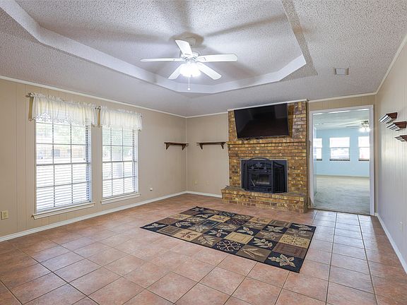 This home is in a quiet neighborhood and is unrestricted and outside city limits providing lower taxes and more freedom. The home sits on .589 acres with a park like setting of beautiful trees including two pecan trees. The home has a two car detached garage and an oversize two car carport. All rooms have ceiling fans. Has a large screened in patio with Bluetooth sound system and 55 inch wall mounted TV. Kitchen has solid surface counter tops, an under cabinet microwave, super quite dishwasher and LG stainless steel 4 door refrigerator, a large pantry, new vinyl plank flooring and room for a kitchen table. The dining room and family living area has ceramic tile flooring and a brick fireplace with insert and mounted 55 inch TV. Living room has a 65 inch mounted smart TV, 7 speaker surround sound amp with speakers, and a tornado shelter for 8 which is placed behind the brick fireplace for additional safety. The 1 quarter inch steel thick lockable tornado shelter has a safe inside the steel lockable bench - 3 levels of locks. The home has a Lennox iComfort M30 smart thermostat, 3 carpeted bedrooms, 2 full baths with ceiling heaters. Master bedroom has a 55 inch mounted TV and ironing board in the wall. The home also comes with: 5 Wyze security cameras including a doorbell camera, a Craftsman riding mower, a 40 volt Ryobi edger, a 40 volt Ryobi weed eater, and 4 firesticks for the 4 TVs. Property has a chain link fence around the back yard with 4 gates, two of which are wide enough for a truck to drive through. Once new owner has internet, the old owner will help the new owner setup all the smart home devices if new owner would like that.