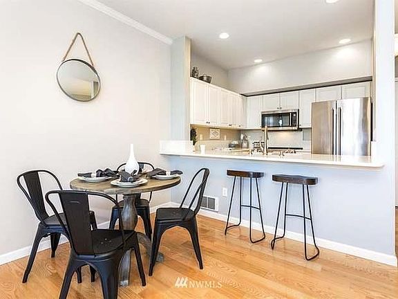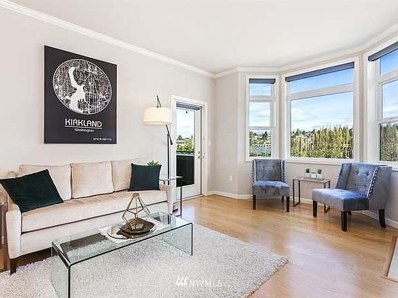 2 bedroom condo in the sought after Plaza on State. Just steps from the Lake, Google Campus & Kirkland Urban! Renovated throughout, the kitchen features stainless appliances, white cabinets, and quartz countertops. The light-filled living space leads out to the massive covered deck overlooking the city. The spacious master bedroom boasts dual closets + private master bathroom with double sinks & stunning tile shower. Hardwood throughout & tile in both bathrooms. 2 parking spaces, storage unit, & bike storage. Water + sewage utilities included. Photos show furnished apartment but will be provided unfurnished.