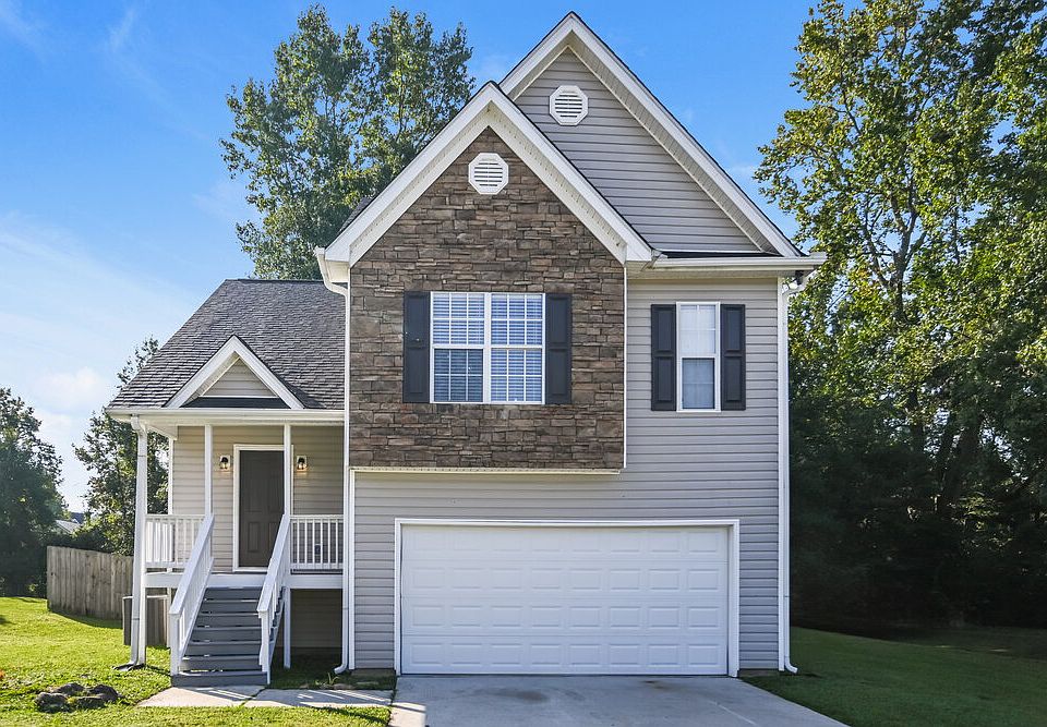 A charming front porch and an attached garage are the first things you'll notice about this three-bedroom, two-bathroom rental home in Griffin. Gather with family by the cozy tile fireplace in the living room, which has an expansive feel thanks to the big windows and vaulted ceiling. A breakfast nook with a bay window in the kitchen is the perfect spot to take your meals. Notice the handy pass-through window and stainless steel appliances in the kitchen. A tray ceiling with a fan makes the master bedroom feel luxurious, and its en suite bathroom includes two vanity sinks and an inviting oversized tub. A wooden deck overlooks the fenced-in yard out back. Apply today to tour this home.