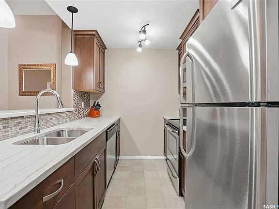 Welcome to Bellagio Terrace, one of Regina’s upscale condo communities, perfectly located in the heart of Hillsdale—steps from Wascana Park, University of Regina, Wascana Rehab, Conexus Arts Centre and countless south-end amenities. Beautifully maintained 2nd floor unit offering 885 sq ft of comfortable MOVE IN READY living space with 2 bedrooms + 2 bathrooms. This home is ideal for 1st time buyers, busy professionals or anyone looking to simplify their lifestyle without compromising on quality, style & convenience. Step inside to an inviting open-concept layout with warm neutral tones and large windows creating a bright atmosphere. Modern kitchen features rich maple cabinetry, tiled backsplash, stainless steel appliances and a sit-up island—perfect for entertaining or casual dining. The dining and living area opens to a private balcony, where you can enjoy your morning coffee, unwind after work or grill a steak on your BBQ. The large primary suite features a walk-in closet and 3-piece ensuite, while the second bedroom and full 4-piece bathroom provide flexibility for guests or a home office. Additional highlights include new carpet, top down bottom up custom blinds, central A/C, in-suite laundry & storage room plus 1 underground heated parking stall which is a luxury during SASK winters. This parking stall is a preferred spot and fits a full sized pick up and is easy to navigate. Condo fees include: heat, water, common area maintenance, snow removal, lawn care and building insurance which make ownership simple and stress-free. Residents enjoy access to a well-equipped fitness room, owner's lounge (currently under reno to refresh the look) and secure elevator access—all in a quiet, pet-friendly building managed by W Management. Whether you’re a first-time buyer ready to build equity, a professional seeking convenience or a down-sizer looking for lock-and-leave comfort, the Bellagio Terrace condo delivers the perfect blend of style, security and location.