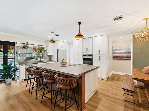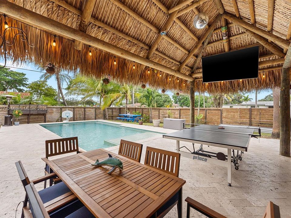 Stunning pool home on a large corner lot in the highly sought-after Hollywood Hills neighborhood. Enjoy an open-concept layout with a modern farmhouse kitchen, massive island, custom cabinetry, new appliances, and luxury vinyl plank flooring throughout. Spacious living & dining areas flow seamlessly for family time and entertaining. Step outside to your private tropical oasis with a high-end custom pool, tiki hut, travertine patio, fruit trees & outdoor entertaining area. 2018 tile roof, Impact windows, and plenty of parking in the large circular driveway. Located on a quiet, tree-lined street within walking distance to houses of worship and near top schools, parks, dining, shopping, and major highways. Perfect for both everyday comfort and unforgettable gatherings. Move quick on this one!