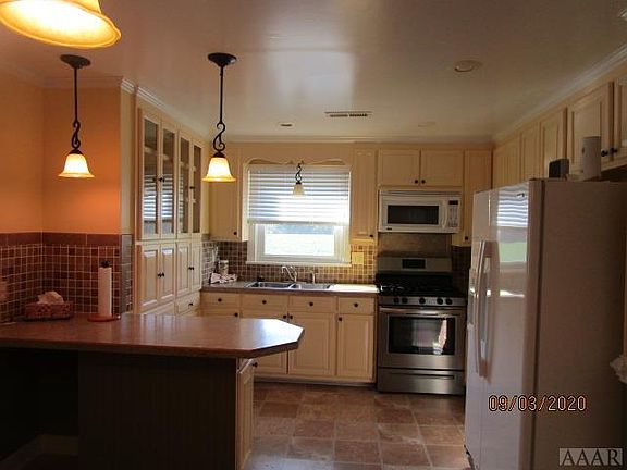 Off the beaten path yet minutes from everything Elizabeth City has to offer! Three bedroom, two bath home with living room, den, updated kitchen with dining area, utility room, attached 1 car garage with window unit air unit and detached 1 car garage with work area. Off the den door is a low deck with built in benches which makes entertaining fun and easy! Partially fenced in yard with a storage shed, lovely landscaping, gas range, tile hall bath shower, double closets in the hall, garage door openers,gutters, plus no city taxes or flood zone. Commuters dream, only 20 miles from VA line!