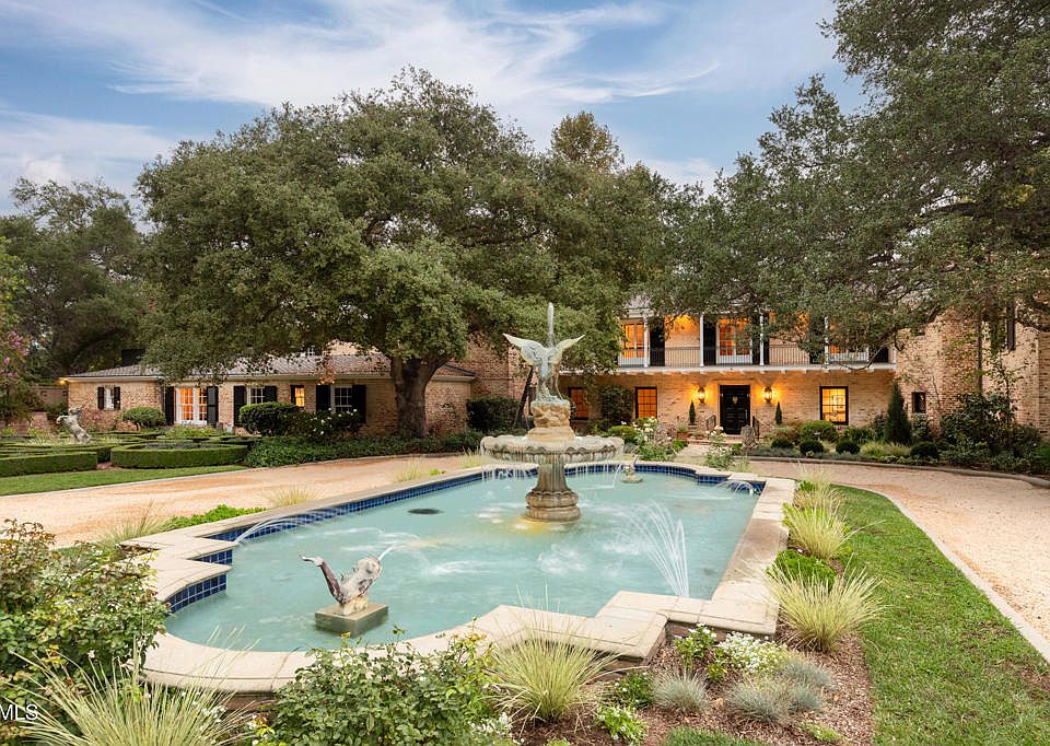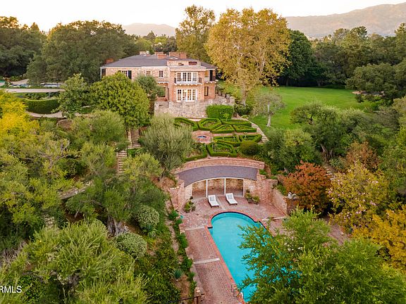 Pool houseTen car garageSet on five acresNorth-south tennis courtOlive treesSweeping circular drivePaths through stately oaks