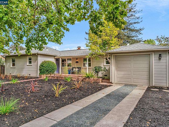 Nestled on a tree-lined and picturesque cul-de-sac, this light-filled, beautifully appointed home is located in the convenient and coveted Saranap neighborhood! Inviting brick porch, gleaming newly refinished oak hardwoods, fresh paint, dual pane windows, designer lighting, elegant stone fireplace surround, and a recently updated bathroom with stone counters, custom cabinetry, and rich tile finishes, and walls of windows looking out to the enchanting setting. The sunny East-facing kitchen features stainless steel appliances, gas range oven, impressive stone counters, a breakfast nook, views of the private garden setting. Adjacent to the kitchen is an combined office and laundry room/mud room which leads out to the one-car garage. The large level lot features filtered views of Mt Diablo, a backdrop of majestic mature trees, raised garden beds, Napa-style plantings, colorful and fragrant foliage, roses, brilliant tulip tree, brick and stone paver entertaining patio, and plenty of room for future home expansion or endless landscape ideas! Prime location, easy commuting access, top-rated schools, nearby open space, and a convenient stroll to downtown amenities, world-class shopping and restaurants.