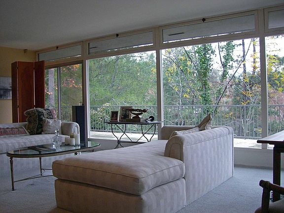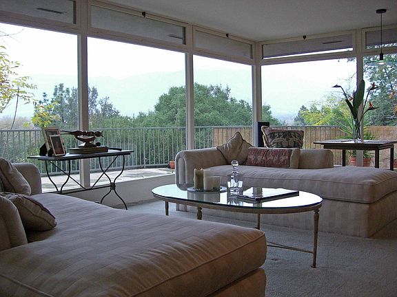 Beautiful mid century 1948 architectural residence designed by Leland Evison. The home has his signature glass walls with operable transoms. Glass walls overlook large patio, Arroyo and Rose Bowl. 3 bedrooms, open living room and dining room, galley kitchen, one full bath with tub and 1/2 bath. One of the bedrooms makes a great office with the 1/2 bath. Private setting up a long, private driveway in the Linda Vista area of Pasadena. Convenient location 3 doors off of Linda Vista Avenue. Walking distance to the Rose Bowl, Pasadena Aquatics Center, and Old Pasadena. The home is well maintained. $40 credit check fee per person on the lease with application. One year or longer lease available. Please do not disturb resident.