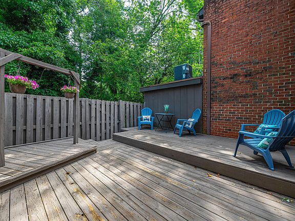 Large private deckBright kitchenOpen floor planWooded backyardLiving and dining areas