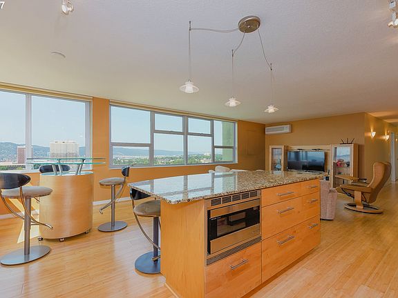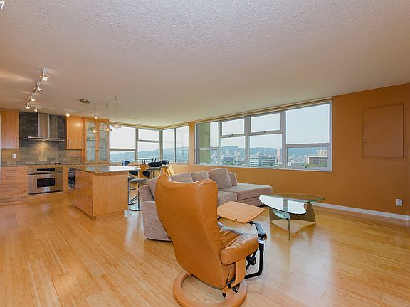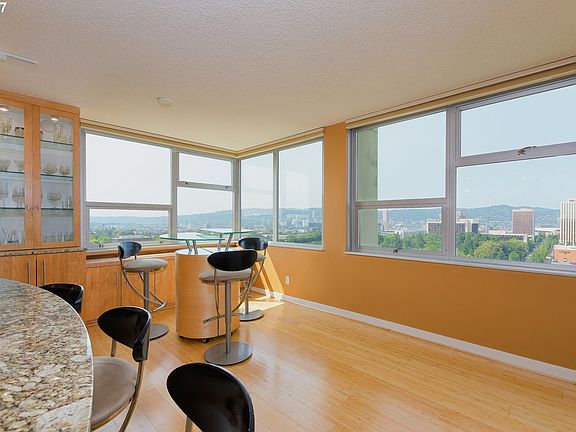 Sweeping, unobstructed views from every room! Fully remodeled with the highest quality standards. In the heart of the Lloyd District, close to restaurants, MAX, shopping. Gourmet island kitchen w/custom cabinets, slab granite & high end appliances. Huge master suite w/ walk-in closet. Spacious 2nd bedroom/office with a great view. New windows. Sunny SW corner Penthouse. Deeded parking. A/C. Perfect Portland condo living.