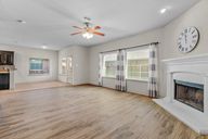 Corner fireplaceNew plush carpetingOversized two-car garageBrand-new vinyl plank flooringFlexible dining areaCovered patioCovered back patio