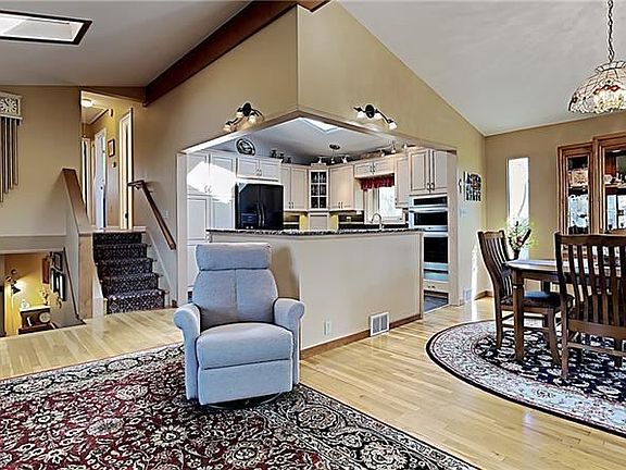 A true multi-level, this home offers a unique floor plan filled with wonderful spaces. A covered porch leads to the entry level featuring a large master bedroom, updated full bath and laundry. The main level of the home boasts open living space with sloped ceilings and skylights. The living room is spacious with hardwood flooring that flows into the dining room with chandelier. Updated kitchen with ceramic tile flooring, tile backsplash, pantry with pull-out shelves, and upgraded appliances. Double doors open to the delightful sun room (dedicated heat/cooling). The upper level offers three bedrooms with hardwood flooring and served by an updated full bath. The lower level includes a family room with fireplace, den and large storage/utility space. 2 car heated garage. Large shed for lawn equip & even car storage. The acre+ home site offers plenty of room for outdoor fun. Large storage shed included. Additional 1+ acre home site to right available for purchase separately.