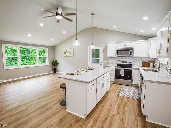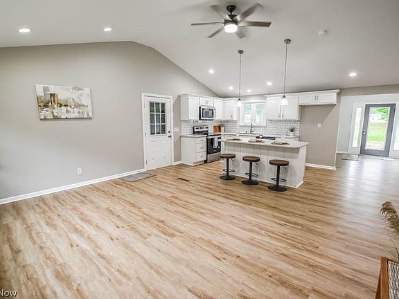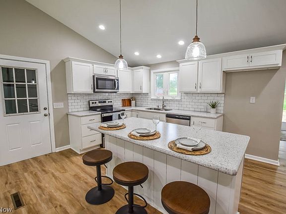 Stunning 4 bedroom 2 full bath ranch with a finished lower level! Tons of improvements have been made here including new flooring, interior and exterior paint, windows, downspouts, sump pump, holding tank, hot water tank, interior doors, trim and more. Enjoy the beautiful open floorplan with a picture window and vaulted ceiling. Be the 1st to prepare meals in the new kitchen with white cabinetry, tile backsplash, stainless steel appliances and a center island with counter seating. Bonus room off of the kitchen houses the convenient 1st floor laundry and provides access to the spacious backyard. Down the hall is the master suite boasting a walk-in closet and new full bath concealed by sliding barn doors. Two more bedrooms on the main level share the updated full bath in the hall. Extra living space in the lower level with a finished rec room plus the 4th bedroom, perfect for guests or as a home office. Added features include an attached 2 car and detached 3 car garages and a large leve