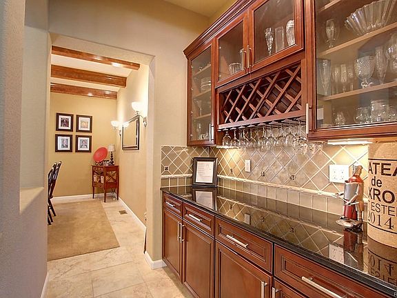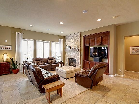 Spectacular FORMER MODEL single-family, ranch-style home with top-of-the-line upgrades throughout, 2 separate patios, including stunning travertine flooring with custom inlays. Your future home offers 5 bedrooms, formal Dining Room with Butler's Pantry, Gourmet Kitchen with casual Dining, granite-slab with decorative-tile backsplash, Cherry cabinets with rope-crown molding, large island, and stainless-steel appliances. Great Room has built-in media center and gas fireplace. Spacious main-floor Master features private 5-piece bathroom with custom walk-in closet. Partially-finished basement has Rec Room with full bar, Family Room, 2 bedrooms and bathroom. Enjoy Mountain Views from the patio, which is professionally landscaped with stained concrete and hot tub! Great corner lot! 3-car tandem garage! Gorgeous! Call now for your private tour!
