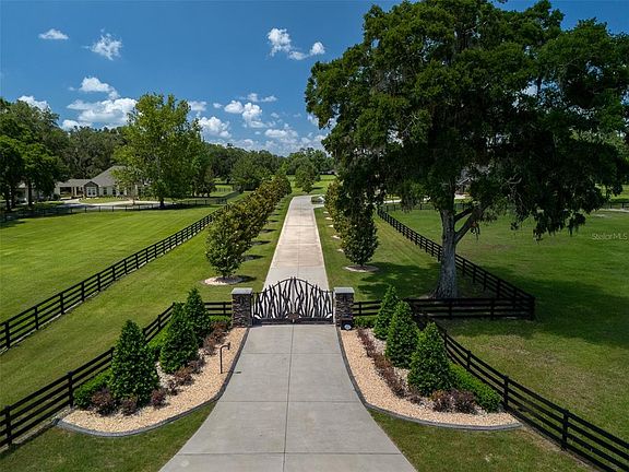 Located in the Farmland Preservation District of NW Ocala, this 27.53-acre equestrian estate is just 10 minutes from the World Equestrian Center and 8 minutes from HITS! Fully renovated and expanded in 2022, the property blends luxury living with world-class equestrian facilities. Custom gates open to landscaped grounds with two private paved drives—one to the main residence, the other to the barns, guest home, and operational buildings. The concrete block, center-aisle main barn includes a sprinkler system, brick pavers, tongue-and-groove ceilings, 8 matted stalls with fans and water, foaling stall, 2 hot/cold wash racks, and a climate controlled tack/feed room with half bath and laundry. A professional arena with nylon footing and advanced drainage ensures year-round use. Attached is a 1350 square foot 2-bedroom, 2-bath residence with a wraparound porch, expansive kitchen, and laundry—ideal for guests or staff. Additional amenities include a brick-paver fire pit area, three paved RV sites with full hook-ups, plus a large insulated metal building with double pull-through bays, carport, and porch. Two more barns add six stalls with electricity. The 4-bedroom, 3-bath main home features a great room with linear fireplace, formal dining, office with built-ins, chef’s kitchen with oversized island, high-end appliances, and premium finishes. The owner’s suite offers a spa-inspired bath and custom walk-in closet with concealed safe. Outdoor living includes a heated saltwater pool with sun shelf, spa, fire/water bowls, and expansive paver lanai with outdoor kitchen, gas fireplace, TV and sound system. Other highlights are a 3-car garage, Porte Cochere, whole-house generator, solar with Tesla battery backup for outbuildings, security cameras, and 12 fenced pastures with room to expand. This estate delivers unmatched equestrian infrastructure and modern amenities, minutes from Ocala’s premier venues!