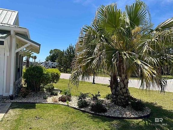 Welcome to your luxury RV paradise in coastal Alabama! This stunning waterfront home in Lake Osprey RV Resort Country Club offers the perfect blend of luxury, comfort, and entertainment all within a fabulous resort community with uncompromised amenities. This is a true home and vacation combined in one! The poly-finished driveway is designed for a large RV (class A, C & 5th wheels) with full hookups. The home, fully furnished, offers an open floor plan with vaulted ceilings, airy and light with wood beam accents. Stainless steel appliances, granite counters, and glass tile backsplashes create an elegant kitchen space with a center island bar with seating. The house is designed with maximum storage spaces with white cabinetry and a large walk-through closet in the bedroom. The master bath has a double vanity, and a gorgeous no frame walk-in shower with exquisite artistic tilework. In the living room, open or close the sliding double door shades. Walk right out from the living room to an outside patio with a beautiful glass bead fire pit for informal gatherings and relaxation with a stunning lake view. The main side entry area includes a full outdoor built-in kitchen with a grill and sink with seating for six. The resort itself is a subdivision with an HOA. Monthly dues of $320 include to the site, water, sewer, trash pickup, internet, cable TV and lawn care. The community amenities include a gorgeous clubhouse, scheduled activities, a commercial kitchen, fitness center, infinity pool and hot tub, tiki bar, putting green, dog park and three pickleball courts. The RV pad and the outdoor spaces can also be rented when the property is not in use for investment income. For you the RV traveler, experience the epitome of an elegant home to own, in a welcoming RV community where you can come and go from your new home base! Plus, an RV is not necessary to own this home.