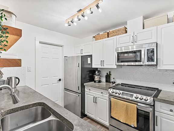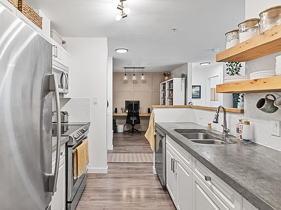 Top floor, south-facing & nearly 1,000 sq ft of bright, updated living! This 2 bed, 2 bath condo features custom countertops, stylish backsplash, newer floors, fresh paint, modern lighting & an induction stove. Enjoy your private deck with peaceful treetop views. Ideal layout with separated bedrooms—perfect for guests, roommates or working from home. Walk to shopping, transit, schools & more. Easy West Coast Express access. Pride of ownership—move-in ready at $534,900!