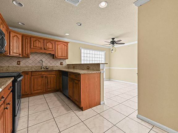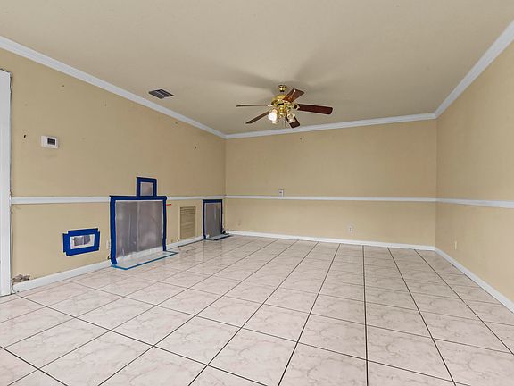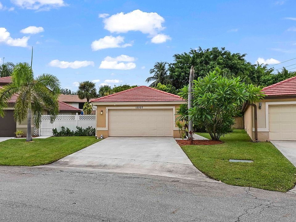 Welcome to Wellington Downs, where comfort and convenience meet in this well-maintained 1-story home offering 1,259 sqft of living space. This property features 3 bedrooms and 2 bathrooms, designed with a split bedroom layout for added privacy.The inviting interior boasts tiled floors throughout, recessed lighting, and crown molding for a modern touch. The kitchen comes equipped with appliances, wood cabinets, counters with bar seating, and plenty of space for meal prep and entertaining. Enjoy peace of mind with accordion shutters and the convenience of a 2-car attached garage. Outside, the fenced backyard offers privacy and room to create your own outdoor retreat with potential for a pool.
