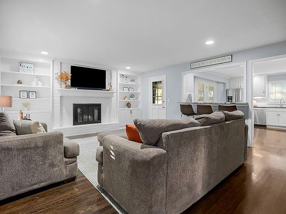 Welcome to this beautifully maintained 4-bedroom, 2-full-bath home nestled in the desirable Oak Park area. The main level features beautiful hardwood floors, a bright family room with a cozy fireplace and custom built-ins, and a remodeled kitchen with fresh white cabinets, pull-out shelving, pantry, gas stove, and gorgeous granite countertops. An open granite bar connects the kitchen and living room, creating an inviting flow for entertaining. The living room opens to a newer deck—both covered and open—with a dedicated space for an outdoor TV, perfect for relaxing or entertaining year-round.