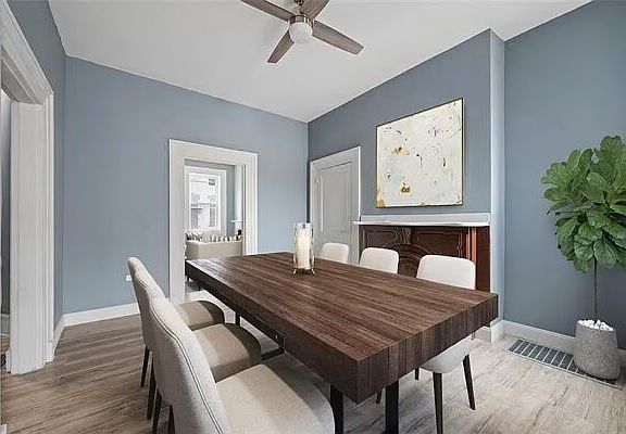 Bright living and dining rooms with decorative fireplaces
