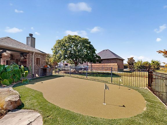 The outdoor cabana kitchen includes a built-in grill, drawers, refrigerator, sink, granite counters, a spacious island, and a cozy fireplace—perfect for gatherings year-round. Additional amenities include a sport court, 4-hole putting green, garden center, in-ground trampoline, windmill, pergolas and a wooden arbor swing.