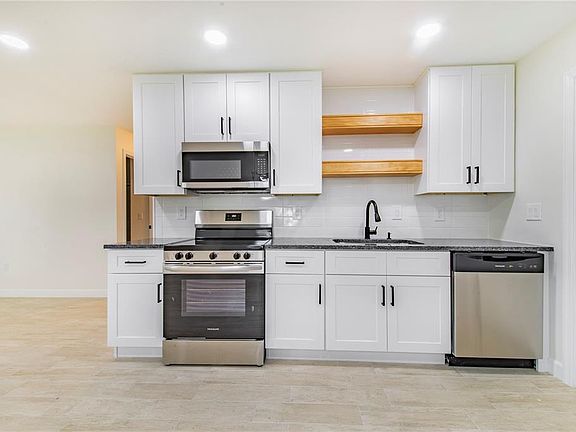 New tileLaundry room in unitCharming open shelvingNew countertopsStainless steel appliancesNew vanity