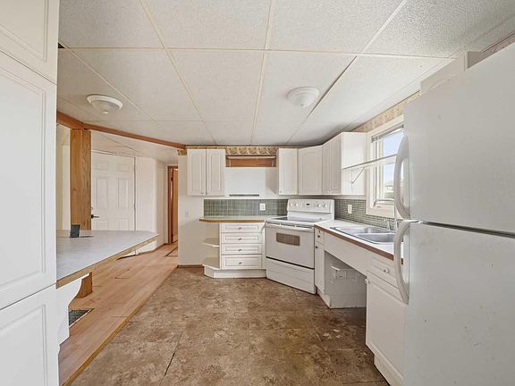Large lotWhite melamine kitchen cabinetsFull tile backsplashLaminate flooringWood deck