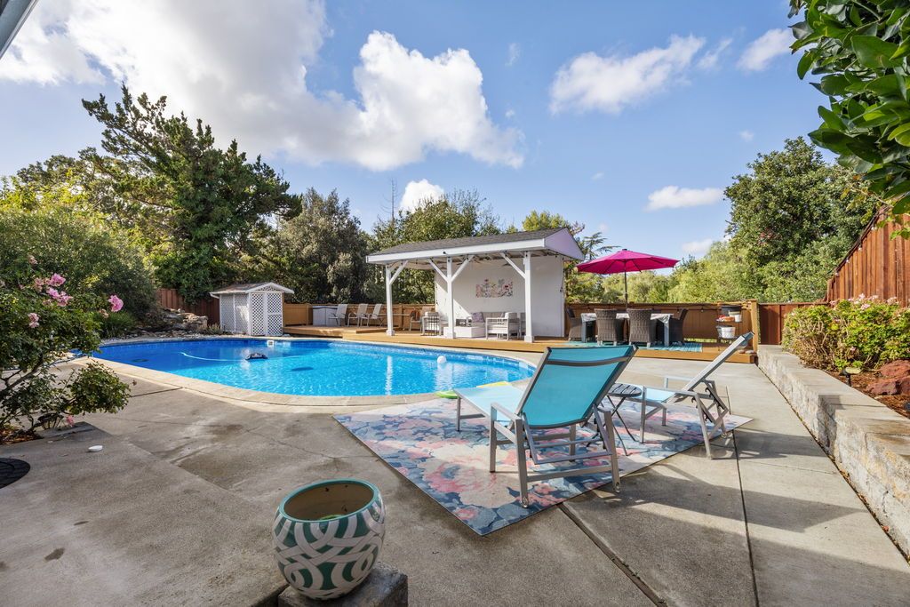 Cozy fireplaceSingle story charmerPrivate backyard oasisQuiet courtBreakfast barSolar-heated in-ground poolNewly updated lighting