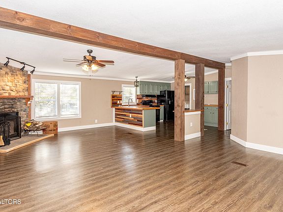 COMPLETELY renovated and move-in ready, this beautiful home is like brand new from top to bottom! Featuring luxury vinyl flooring throughout, new sheetrock throughout, and craftsman trim, every detail has been thoughtfully updated. The open floor plan showcases a wood beam accent open to the living room and dining with a beautiful stone wood-burning fireplace. The kitchen is a showstopper with butcher block countertops, painted cabinetry, an island wrapped in shiplap, and a matching shiplap backsplash.