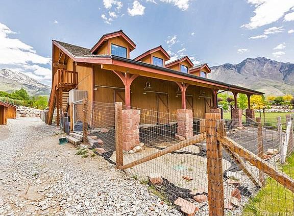 The best available lot in Alpine. High end developments surround this perfectly situated parcel located in the very popular North end of Alpine. Enjoy front porch and rear deck views on your brand new private Estate. Equipped with two state of the art barns. The front barn sits on the pristine manicured southern portion including 8 stalls, indoor hay storage and a fully functioning office. Along the edge are 8 storage sheds with electrical available in most of them. The rear barn can be accessed from the front of the lot as well as Elk Ridge Ln. (possible subdividing on that side) and contains an industrial walk in cooler. A tranquil creek runs right next to the award winning rose garden in the rear of the yard. 80 Fruit trees including apple, pear, apricot, pluot, cherry, plum, peach. 600 oak trees, 65 shade trees, over 30 vegetable garden areas with water available, 5 10 culinary in ground heated waterers, and over 3000 linear feet of custom rock walls.