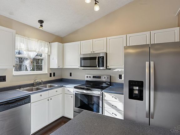 Vaulted ceilingBright open layoutStainless steel appliancesWhite kitchen