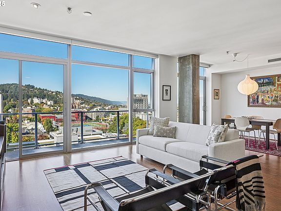 Enjoy a turnkey lifestyle & a breath of fresh air in this light and bright condo on the highest floor possible before the penthouse levels. Mid-century vibes & modern style with an open living area flooded with light from the floor to ceiling windows with two layers of mesh solar shades to control all the natural light you like. Enjoy watching the sunsets & grilling on the balcony spanning over 26'. Clean lines in the kitchen with European-style cabinets, granite counters, a custom full-height backsplash and stainless appliances, including the wine cooler in the eating island. The primary suite is private off the living room with custom wood & glass sliders, custom closets & an en suite bathroom featuring a marble vanity and large soaking tub/shower combination. Matching custom wood & glass sliders enclose the 2nd bedroom for working or hosting guests with the adjacent 2nd bath. The large entry leads to a big laundry room with generous storage space, washer & dryer. Separately deeded & secure parking space is within the building, and includes a private storage room adjacent to the parking space. The building has power for EV charging & each owner can contract to bring the power and install charging stations at each parking space at their own cost. The building has many wonderful amenities: fitness room & library on the 2nd floor, meeting room & common terrace with kitchen & bath on the 3rd floor, plus 24/7 concierge service. Strong HOA & very well managed building. Frequent the new Mark Rothko Pavilion at the Portland Art Museum across the street, events at the Schnitz, Oregon Historical Society, Farmers Markets, classes at PSU, downtown shopping & dining.