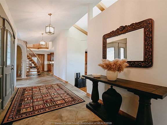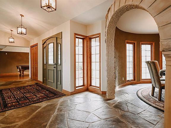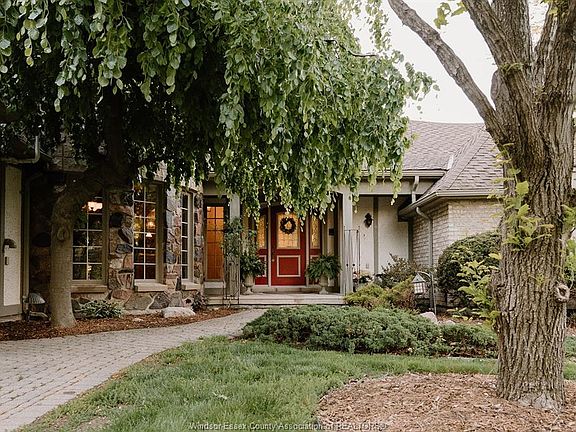 This enchanting 5 bedroom, 3.5 bath custom-built home rests on 100 foot waterfront lot on the shores of Lake St.Clair, wrapped by peaceful grounds with mature trees. Extending 3637 square feet this gem features 2 main floor bedrooms, primary with ensuite and walk-in-closet, intimate dining room, breakfast nook, kitchen with wet bar and wood-burning fireplace. Architectural details define the space with natural stone floors, dramatic beams, Italian oak staircase, turret bedroom, wrought-iron gates and big windows throughout showcasing lake & sunset views. Nestled on an executive dead-end street, less than 5 minutes from marinas and golf course and woodlands ’Ruscom River Conservation Area’ at your front door. This home is great for enjoying nature, seclusion, and entertaining. Truly one-of-a-kind! Reach out to listing agent for updates and inclusions.
