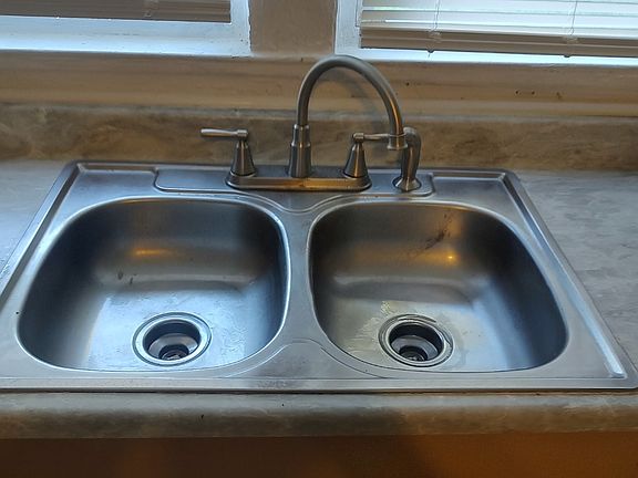 Updated kitchen with stainless steel double-door refrigerator and stainless steel stove