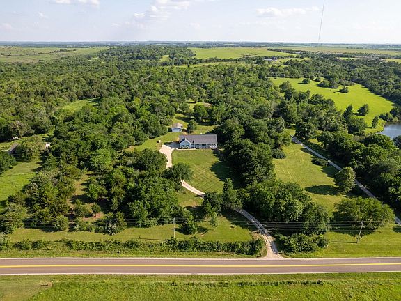 Breathtaking views await as you enter this natural paradise in southwest Topeka. Featuring over 2,200 square feet on the main, the large granite kitchen is a chef's delight, featuring ample counter space, custom cabinets, stainless appliances, and bay windows overlooking the serene countryside. The home boasts 5 bedrooms, 3.5 bathrooms, main floor laundry, including a luxurious master suite with a spa-like bathroom and picturesque views from every window. The walkout basement adds versatility and additional living space, complete with a home theater featuring a 110" surround sound screen—a perfect spot for movie nights or watching the big game. Featuring a two-car attached garage and large outbuilding that can fit at least two more vehicles or any shop you may want to create. The nearly 6 acre property with gated drive includes a variety of mature trees, trails, and open spaces, providing privacy and endless possibilities for outdoor activities. An additional 5.92 acres is also available for purchase doubling the size of your land. This home offers the peace and tranquility of country living without being too far out of town, just a short drive to all grocery, dining, and shopping destinations.Washburn Rural bus stop just a short distance and may be a option. Don’t miss your chance to own this exceptional property!