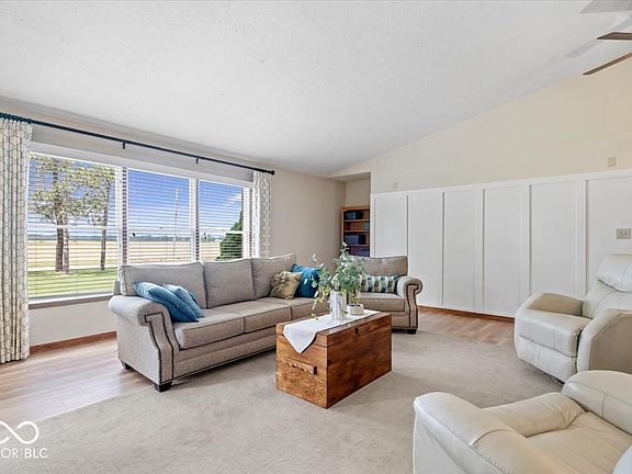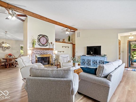 Welcome to this exquisite custom-built, all-brick ranch estate, set on nearly 4 serene acres complete with a stocked pond teeming with bass, sunfish, catfish, bluegill, and tilapia. This 2000 sq. ft. home features a thoughtfully designed 3-bedroom, 2-bath split bedroom floor plan, offering both privacy and spacious living areas. The inviting living room boasts a vaulted ceiling and a masonry fireplace, creating a warm and welcoming atmosphere. The kitchen and dining room combination is ideal for both everyday living and entertaining, featuring modern appliances, a stylish tile backsplash, and a center island. The primary bedroom suite is a luxurious retreat, showcasing a newly remodeled full bath with a tile walk-in shower and a new vanity with dual sinks. A custom-built 14x14 all-season sunroom provides a tranquil space to relax and enjoy views of the pond and the accessory dwelling unit (ADU). The ADU includes a charming front porch, a 24x24 recreational room with a full bath, plumbing for a wet bar, and a 12x24 hobby garage-perfect for a variety of uses. For additional storage and workspace, the property also features a 16x44 separate shop with a single garage door. This isn't just a home; it's a lifestyle. Imagine weekend afternoons fishing in your own pond, family gatherings in the expansive recreational room, and quiet evenings in the sunroom, watching the sun set over your beautiful property. Conveniently located just a 7-minute drive to SR 37 and I-69, this property offers easy access to Noblesville, Fishers, Anderson, Muncie, and Fort Wayne, combining country serenity with urban convenience. Make lasting memories with the perfect blend of luxury, comfort, and practicality in this true one-of-a-kind property.