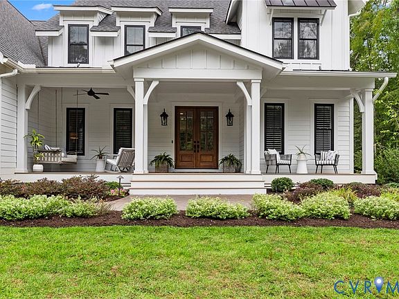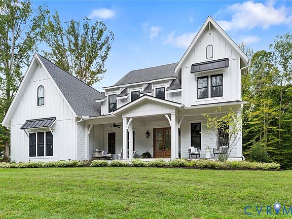 This custom-designed Pacific Farmhouse by Biringer Builders is a masterpiece of craftsmanship & design, blending elevated sophistication with everyday comfort. Situated off of historic Old Gun Road on 2 private acres, the home offers the serenity of a retreat while remaining minutes from conveniences. From the inviting front porch to the welcoming foyer, every detail has been thoughtfully curated. Soaring 10’ ceilings, exquisite moldings & wide-plank wood floors establish an atmosphere of refinement. A paneled dining room & butlers pantry provides the perfect setting for gatherings, while the light-filled family room with beamed ceilings, fireplace, and built-ins flows seamlessly to a three-season screened porch with a stone fireplace—ideal for entertaining & relaxation. The chef’s kitchen is a true showstopper, featuring a large quartz island with breakfast bar, floor-to-ceiling cabinetry, designer backsplash, luxury appliances, and a sunlit dining area. A walk-in pantry, office/mudroom, powder room and laundry enhance main-level living. The primary suite is a luxurious retreat, wrapped in windows with refined crown molding. The spa-inspired bath offers a double vanity, walk-in shower, private water closet, linen storage, and a boutique-style walk-in dressing room with custom built-ins. Upstairs, a versatile loft connects four spacious bedrooms, including a Jack-and-Jill suite plus a second laundry room with cabinetry. An additional suite with full bath offers flexible space for a media room, office or guest accommodations with expansion potential in the wired storage area. The finished lower level provides abundant living space with a great room, playroom, guest suite and direct walk-out to a private patio. An oversized two-car garage offers excellent storage. Outdoors, the property is designed for both recreation & retreat with a sports field and wooded trails and convenient second stone driveway. This remarkable residence offers a rare opportunity to enjoy elevated living in the heart of beautiful Midlothian.