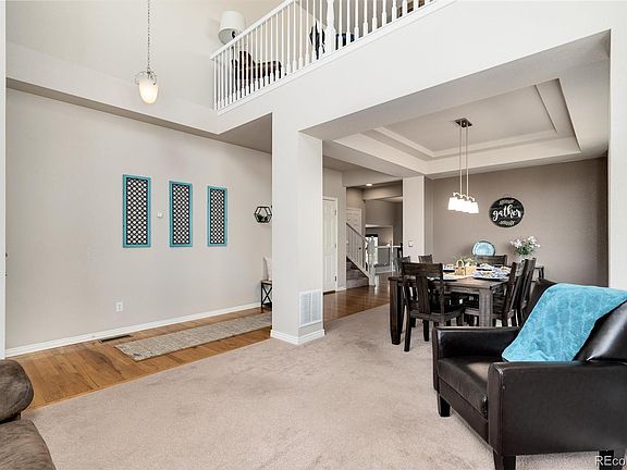 This beautiful home in Parker's Horse Creek neighborhood is a must see! You are welcomed by a cozy, covered front porch. The front room has vaulted ceilings and large windows which bring in tons of natural light. The dining room is a great place for entertaining family and friends, and the main level powder room is updated with a beautiful quartz vanity. The spacious kitchen includes an island, granite countertops, large pantry, stainless steel appliances, ample cabinets for storage, and an eat-in kitchen. From the kitchen, the backyard and composition deck are perfect for relaxing on those warm Colorado days. Upstairs, the primary bedroom features vaulted ceilings, a large walk-in closet, a 5-piece bath ensuite with an oversized soaking tub and glass walk-in shower. The two large bedrooms have generous closets and share a full-updated bath with quartz countertop. An upstairs loft expands the living area and is currently being used as an office, but can be used based on your families needs. The basement is freshly painted and has even more living space, with a media room, hobby/storage room, a large bedroom, and a 3/4-size updated bathroom.