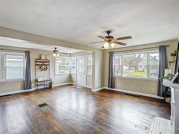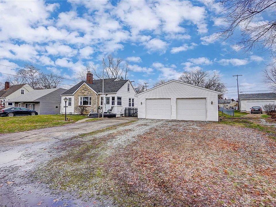 Welcome home! This lovely cape cod is bigger than you think! There's plenty of space to entertain in the open concept living area. The updated kitchen leads into the large outdoor patio and attached fire pit. This home is located on a large lot and the backyard is fenced in. The garage is massive and can fit up to 4 vehicles. Going back inside you will find a large bedroom upstairs with 2 walk in closets with original pine floors. The basement is currently unfinished but has a lot of space to finish it out to whatever needs you have. Located in Clark Shawnee Schools and close to I-70, restaurants and shopping. Schedule a showing before it's gone.