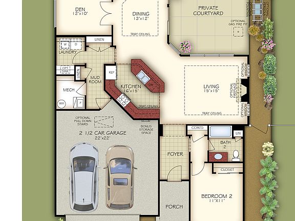 The Portico + features dramatic transitions like the formal entryway highlight the elegance and quality of the open, efficient design. Complementing the exquisiteness of the home are such amenities as the gourmet kitchen and private den that allow you to live in comfort with all the conveniences you desire. .Enjoy the private owner's suite nicely designed with spacious bath .Take advantage of abundant storage and organizational spaces .Gather with friends and family in the home's large, centrally located kitchen Additionally, the Portico + offers intelligent features including a conveniently located laundry room, generous storage space and the optional versatility of a deluxe owner's suite or bonus suite perfect for a guest room. All things considered, the Portico provides a luxurious yet casual living experience that caters to your lifestyle desires.